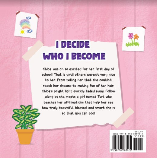 I truly believe that we can do anything we put our minds to. However, there is a level of self-confidence and self-awareness needed to completely walk in our purpose. Confidence in self is the difference between being good and being great! I personally struggled with believing in myself and would allow my own negative self-talk to hold me back from going after the things I deserved. "I Decide Who I Become" is a loving reminder to focus on all the good things about ourselves in spite of the negativity. I hope Khloe and Tori inspire you to see the good in yourself and help others do the same.